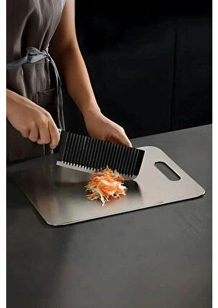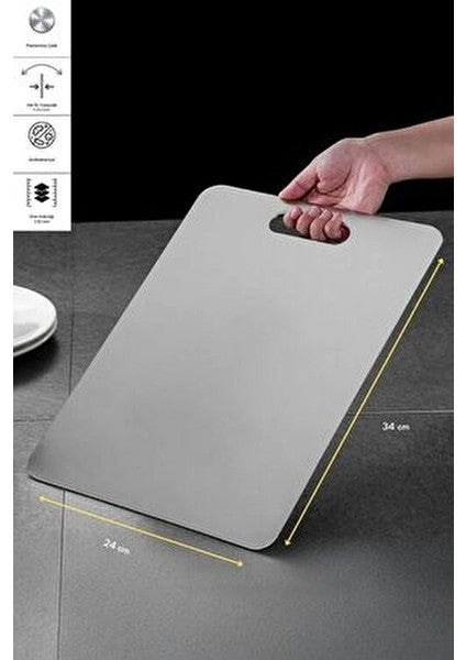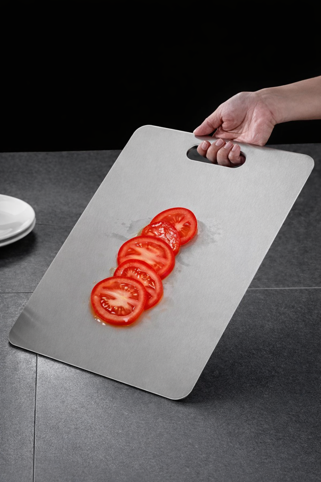- Paslanmaz çelik kesme tahtamızla stressiz pişirmenin tadını çıkarın. Temizlemesi kolay yüzeyleri, bakımı çocuk oyuncağı haline getirerek sadece suyla silin. Hafif tasarım ve taşınabilirlik, mutfakta verimliliği daha da artırarak yemek pişirme sanatına odaklanmanıza izin verir.